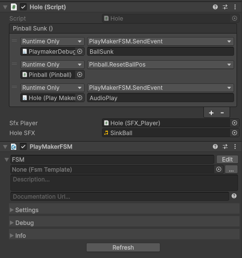 Hero Mech Pinball used two different coding frameworks to implement features. I used Unity’s script system, while my friend used Playmaker visual scripting. We used Unity Events to provide an abstracted and visual way to connect the two systems together.