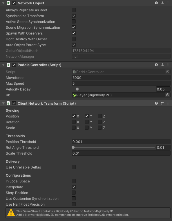 Another hurdle I overcame was synchronizing the movements of objects on two different systems. I did this by using a Network Object to communicate transform information and a Client Network Transform to apply that information on both systems. Similarly the ball also uses these components, but also receives information about it’s current direction for collision checking.